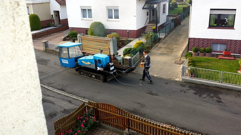 Hier wird die "Bohrmaschine" durch die Gartenstraße zum neuen Einsatzort gefahren ...